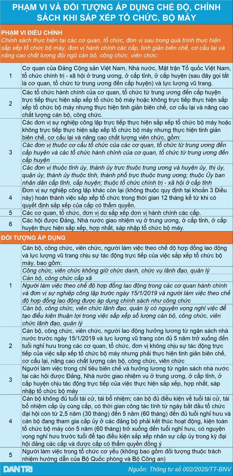 Cụ thể, so với Thông tư 01/2025/TT-BNV, Thông tư 002/2025/TT-BNV mở rộng phạm vi áp dụng chính sách với nhóm người làm công tác cơ yếu; các hội quần chúng được Đảng, Nhà nước giao nhiệm vụ ở trung ương, cấp tỉnh, cấp huyện thực hiện sắp xếp...