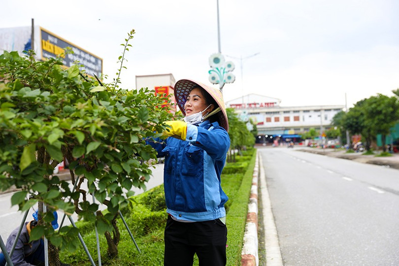 Công nhân Trung tâm Dịch vụ hạ tầng và môi trường đô thị thị xã chăm sóc cây xanh trên đường Nguyễn Thị Bích Châu.