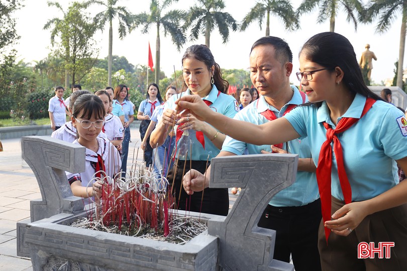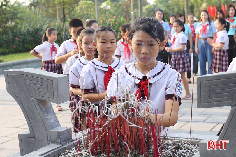 Dâng hương, dâng hoa và báo công với Bác, các em thiếu nhi Hà Tĩnh bày tỏ lòng biết ơn vô hạn và kính trọng đối với công lao to lớn của Người - vị lãnh tụ vĩ đại của dân tộc đã luôn dành tình yêu thương bao la cho thiếu niên, nhi đồng.