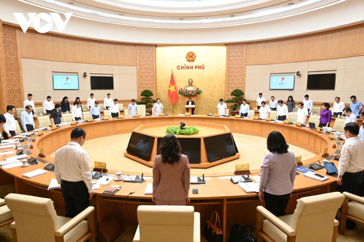 Phát biểu mở đầu phiên họp Thủ tướng Phạm Minh Chính xúc động chia sẻ: "Chúng ta đi qua tháng 7 trong niềm tiếc thương vô hạn của đồng bào, đồng chí cả nước trước sự ra đi của Tổng Bí thư Nguyễn Phú Trọng, nhà lãnh đạo đặc biệt xuất sắc, kiên trung, có uy tín lớn, trọn đời bền bỉ cống hiến cho sự nghiệp cách mạng của Đảng và dân tộc ta". Các thành viên Chính phủ đã dành một phút tưởng niệm cố Tổng Bí thư Nguyễn Phú Trọng.