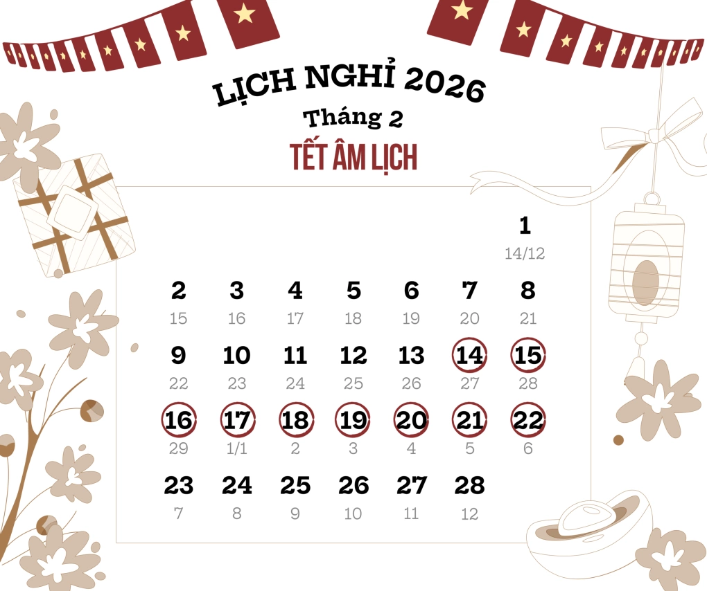 Theo đó, công chức, người lao động sẽ nghỉ 5 ngày theo quy định (một ngày trước và bốn ngày sau Tết), cộng thêm bốn ngày cuối tuần trước và sau, tổng cộng 9 ngày. Công chức, người lao động trở lại làm việc ngày 23/2, tức mùng 7 Tết.