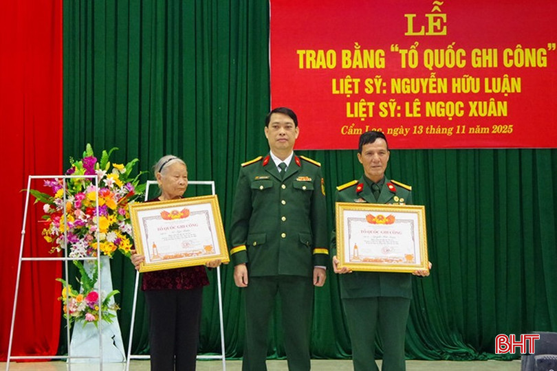 Đại tá Nguyễn Tất Thắng - Chủ nhiệm Chính trị Bộ CHQS tỉnh Hà Tĩnh trao bằng Tổ quốc ghi công cho thân nhân liệt sỹ Lê Ngọc Xuân (SN 1926) và thân nhân liệt sỹ Nguyễn Hữu Luận (SN 1929) cùng ở xã Cẩm Lạc.