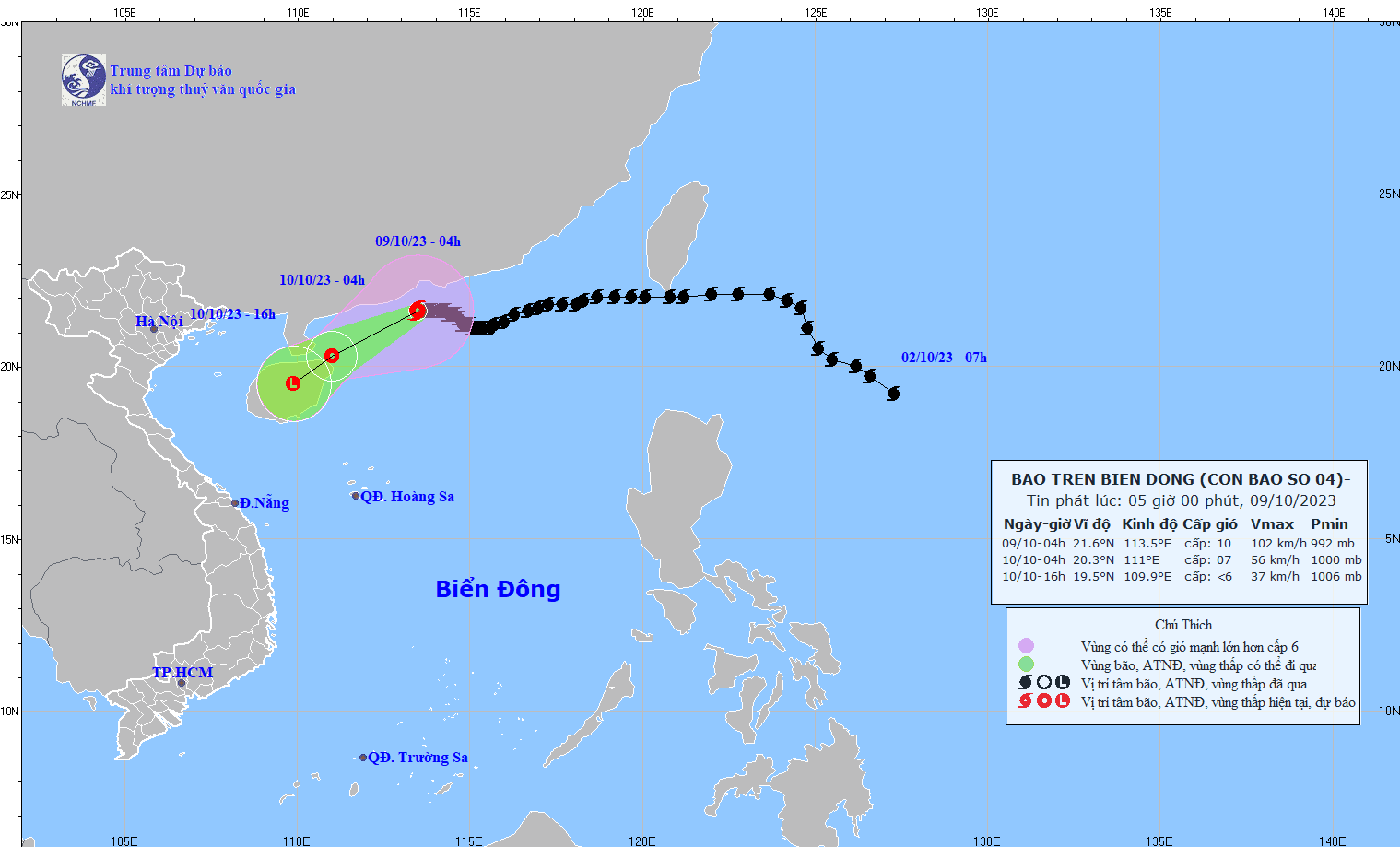 Sức gió mạnh nhất vùng gần tâm bão mạnh cấp 10 (89-102km/h), giật cấp 13, di chuyển chậm theo hướng Tây với tốc độ khoảng 5km/h.