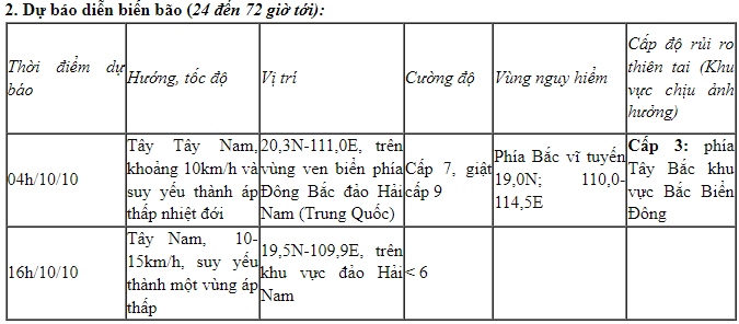 Khu vực Bắc Biển Đông sóng cao 2,0-3,0m, vùng gần tâm bão sóng cao 3,0-5,0m. Từ sáng 10/10, ở vịnh Bắc Bộ sóng cao 2,0-3,0m.