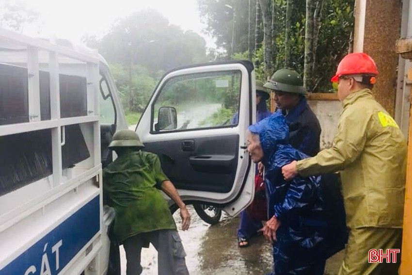 Chiều 20/9, Công an xã Sơn Bằng (Hương Sơn) phối hợp với chính quyền địa phương hỗ trợ 10 hộ già cả, neo đơn ở vùng thấp trũng, có nguy cơ ngập sâu tới nơi an toàn. Ảnh: Ánh Dương