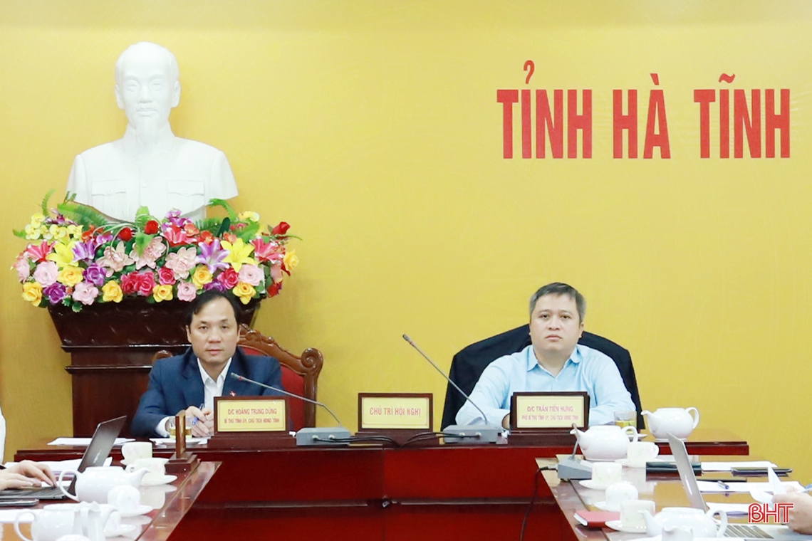 Bí thư Tỉnh ủy Hoàng Trung Dũng, Chủ tịch UBND tỉnh Trần Tiến Hưng điều hành tại điểm cầu Hà Tĩnh.