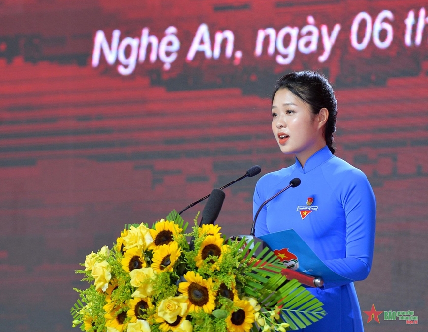 Em Võ Thị Phương Trang, học sinh Trường THPT Lê Hồng Phong, huyện Hưng Nguyên phát biểu tại buổi lễ.