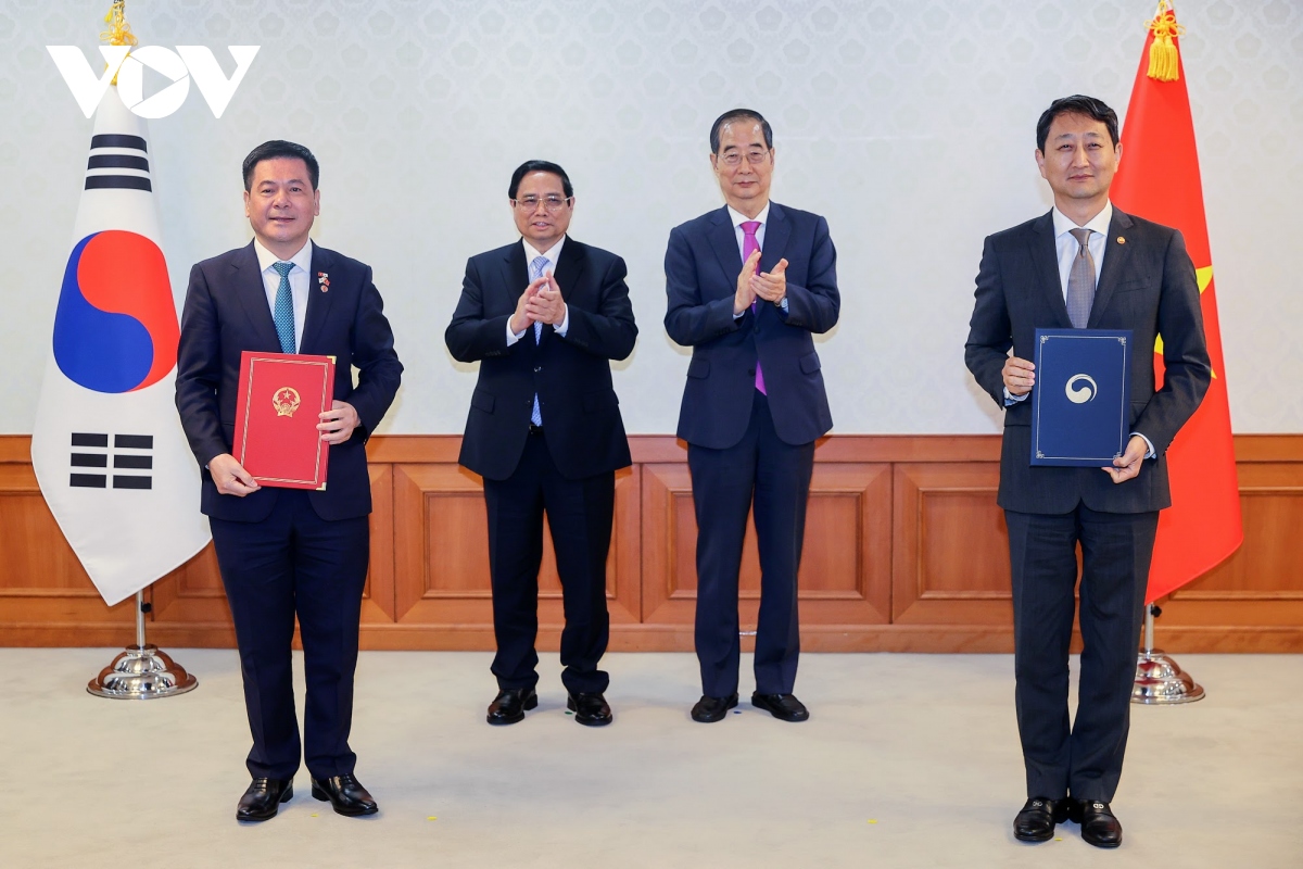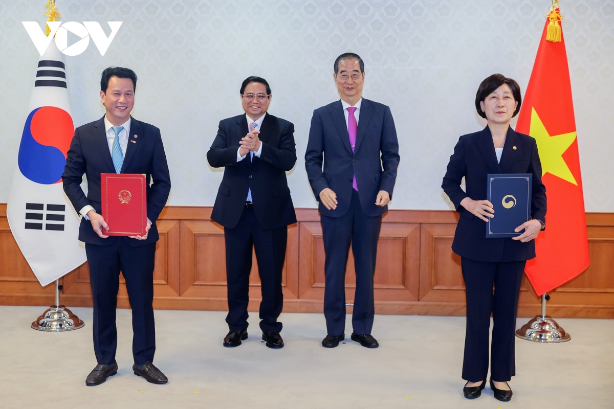 8. Nhân chuyến thăm chính thức Hàn Quốc của Thủ tướng Chính phủ Phạm Minh Chính, Thủ tướng hai nước đã chứng kiến Lễ trao 09 văn kiện hợp tác được ký kết giữa các bộ ngành trong các lĩnh vực như phát triển, thương mại - đầu tư, doanh nghiệp vừa và nhỏ - đổi mới - khởi nghiệp, môi trường, cạnh tranh và bảo vệ người tiêu dùng, giáo dục (phụ lục kèm theo).