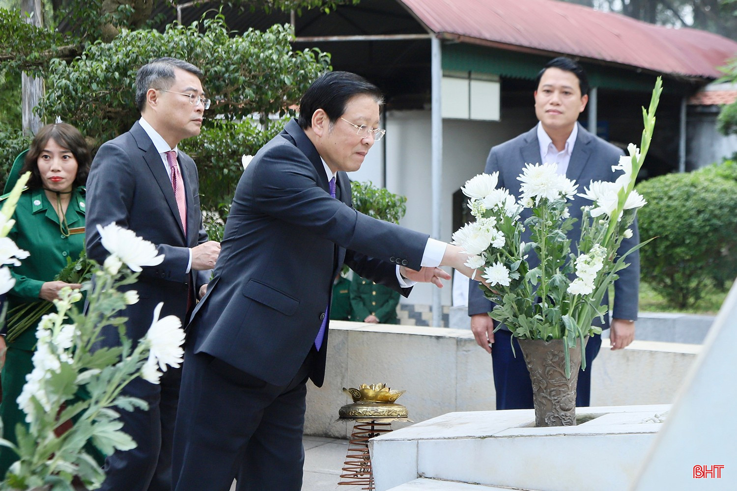 Các đồng chí Ủy viên Bộ Chính trị: Phan Đình Trạc - Bí thư Trung ương Đảng, Trưởng ban Nội chính Trung ương; Lê Minh Hưng - Bí thư Trung ương Đảng, Trưởng ban Tổ chức Trung ương dâng hoa trước phần mộ nữ TNXP Ngã ba Đồng Lộc.