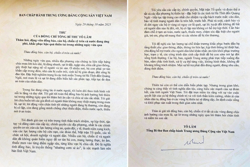 Thiên tai còn có thể còn diễn biến phức tạp. Nhưng trong gian khó, chúng ta càng thấy rõ tình nghĩa dân tộc, càng hiểu sức mạnh của sự đoàn kết, của tình người Việt Nam. Tôi đặt trọn niềm tin rằng với sự vào cuộc quyết liệt của cả hệ thống chính trị và với tinh thần kiên cường, nhân ái của nhân dân ta, đồng bào ở các vùng bị thiên tai sẽ đứng dậy, ổn định cuộc sống và khôi phục sản xuất trong thời gian sớm nhất.