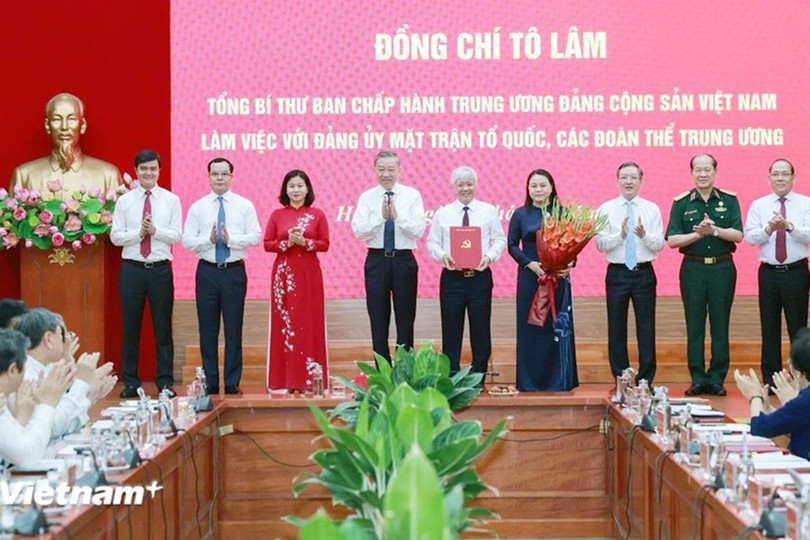 Tổng Bí thư Tô Lâm trao Quyết định số 304-QĐ/TW về chức năng, nhiệm vụ, tổ chức bộ máy Cơ quan Ủy ban Trung ương Mặt trận Tổ quốc Việt Nam (Ảnh: PV/Vietnam+)