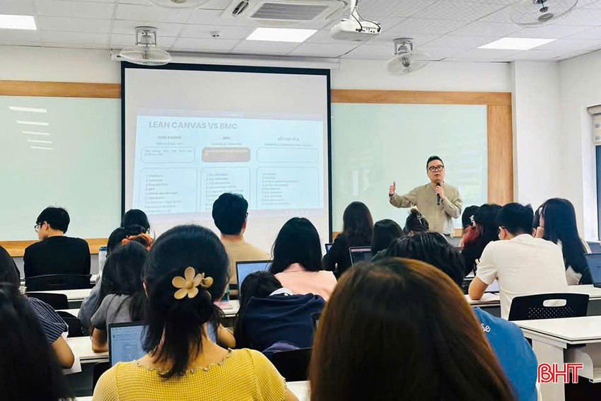 Anh Võ Quang Dũng chia sẻ với sinh viên Trường Đại học Ngoại thương về kỹ năng xây dựng chiến lược kinh doanh. Ảnh: NVCC.