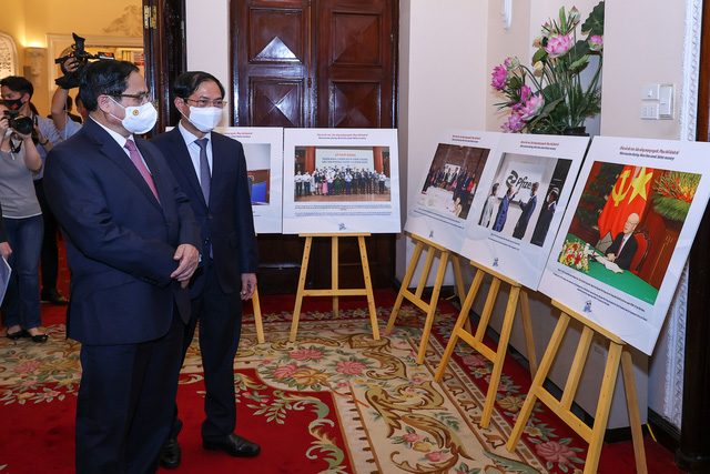 Thủ tướng tham quan khu vực trưng bày một số hình ảnh về công tác ngoại giao vaccine và tiêm chủng vaccine tại Việt Nam - Ảnh: VGP/Nhật Bắc