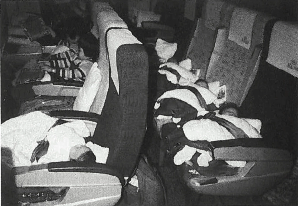 Những em bé Hàn Quốc được thắt chặt vào ghế máy bay trong chuyến đi đến Đan Mạch vào năm 1984. Ảnh: Ủy ban Sự thật và Hòa giải Hàn Quốc