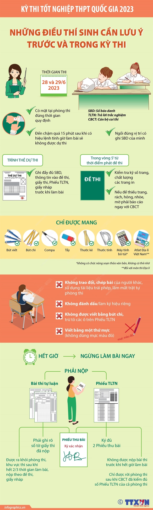 Kỳ thi tốt nghiệp THPT năm 2023 diễn ra từ ngày 27 - 30/6/2023; trong đó ngày 27/6 thí sinh làm thủ tục dự thi, ngày 28 và 29/6 là ngày thi chính thức, ngày 30/6 là ngày thi dự phòng. Có nhiều điểm thí sinh cần lưu ý trước và trong kỳ thi. Đặc biệt, thí sinh cần lưu ý đến đúng giờ, bởi nếu quá 15 phút sau khi có hiệu lệnh tính giờ làm bài, thí sinh sẽ không được tham dự buổi thi đó.