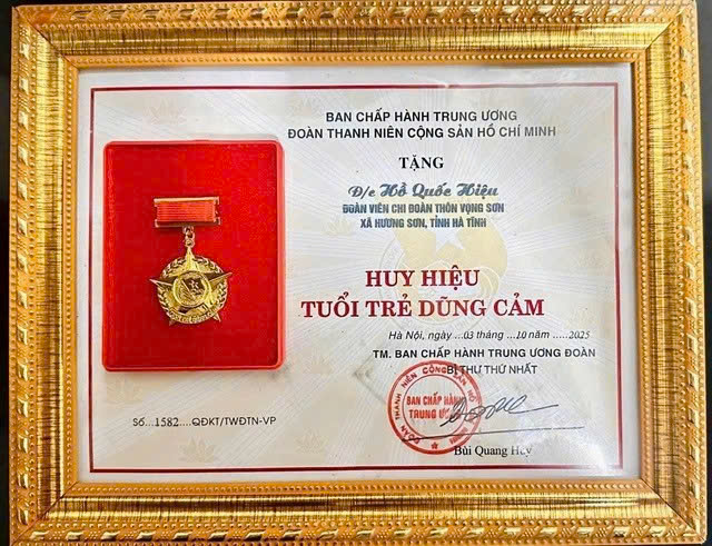 Ngày 14.10, Tỉnh đoàn Hà Tĩnh cho biết vừa tổ chức trao tặng Huy hiệu Tuổi trẻ dũng cảm của T.Ư Đoàn cho đoàn viên Hồ Quốc Hiệu (25 tuổi, ngụ tại thôn Vọng Sơn, xã H