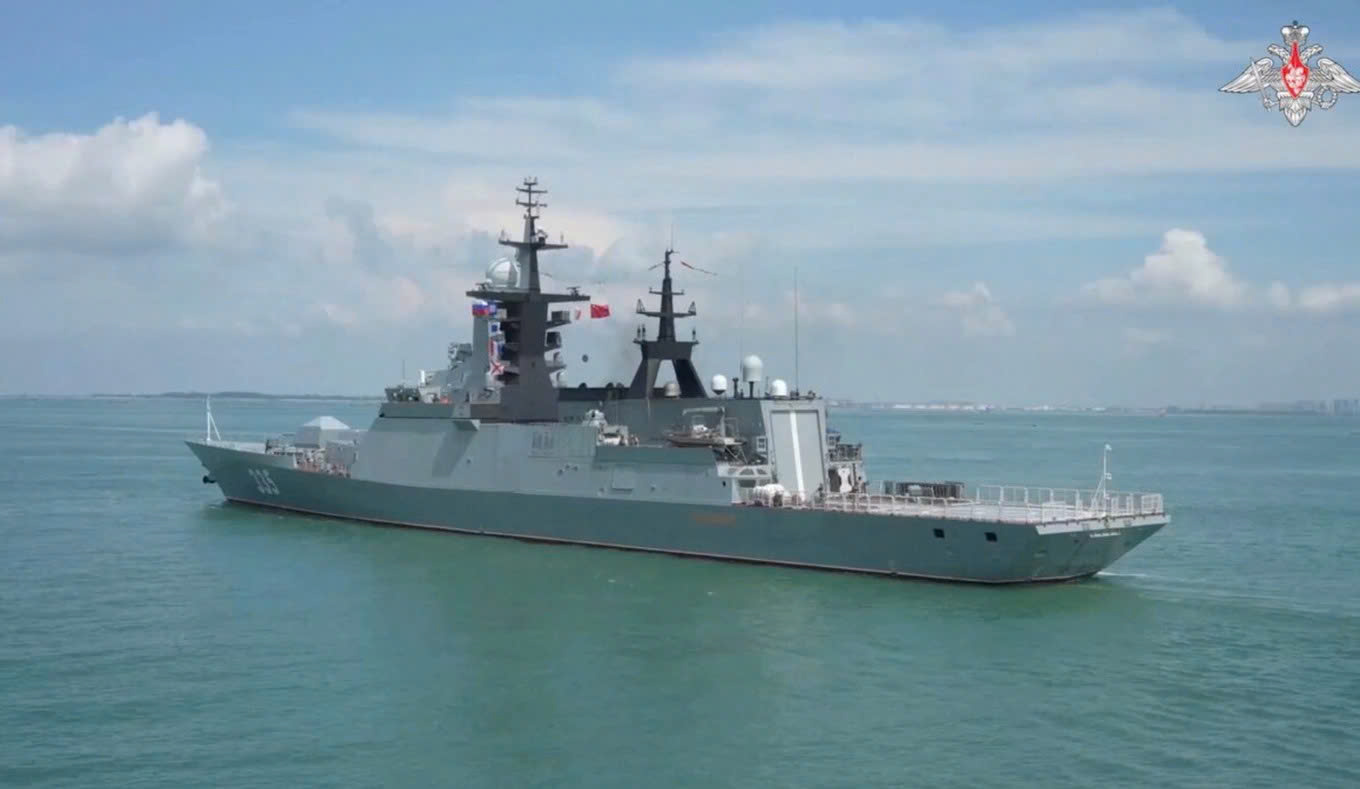 Tàu hộ vệ tên lửa Gromky của Nga tiến vào cảng Trạm Giang trong cuộc tập trận hải quân chung "Liên Hải-2024" Trung Quốc - Nga, tại Trạm Giang, Trung Quốc (Ảnh: Reuters).