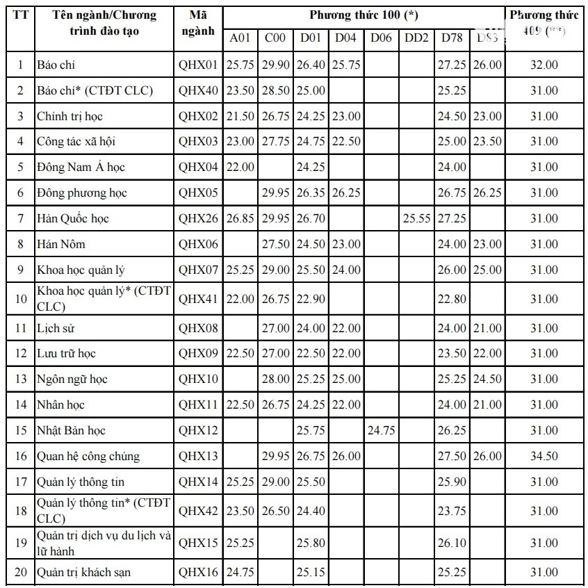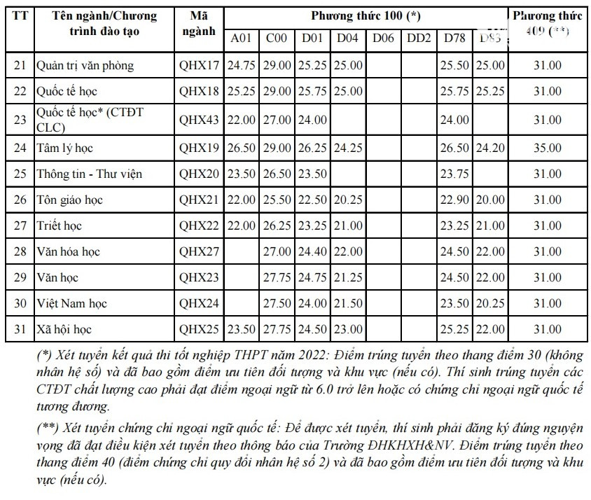 Dưới đây là điểm chuẩn các ngành của Trường ĐH Khoa học Xã hội và Nhân văn - ĐH Quốc gia Hà Nội năm 2022:
