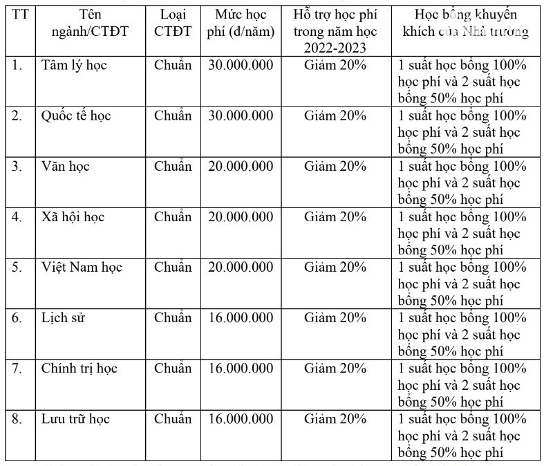 Năm học 2022-2023, Trường ĐH Khoa học Xã hội và Nhân văn - ĐH Quốc gia Hà Nội áp dụng mức học phí như sau:
