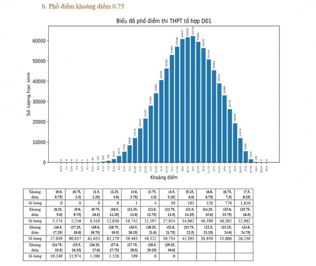 Cụ thể: phổ điểm khối A00 cao nhất khi đỉnh rơi vào 22,5 điểm. Tổ hợp thấp nhất là D01 khi đỉnh ở ngưỡng 18,5-19 điểm. Đối với 2 tổ hợp A01 và B00, đỉnh của 2 khối đều rơi vào ngưỡng 20-20,5 điểm. Ở khối C00, đỉnh vẫn nằm ở ngưỡng 20.