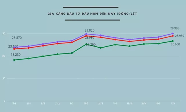 Chiều 11/5, xăng dầu trải qua phiên tăng thứ ba liên tiếp với mức tăng mạnh. Sau điều chỉnh, xăng E5 RON 92 có giá bán 28.959 đồng/lít, xăng RON 95 là 29.988 đồng/lít, dầu diesel 26.650 đồng/lít, dầu hỏa 25.168 đồng/lít. Mức giá này sẽ được áp dụng ở danh sách các tỉnh thành phố thuộc vùng 1 (Hà Nội, TPHCM, Bình Dương, Đồng Tháp...).