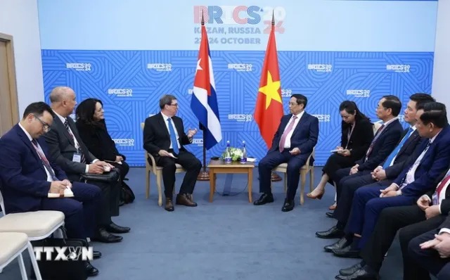 Ngày 24/10, theo giờ địa phương, nhân dịp tham dự Hội nghị thượng đỉnh các nhà lãnh đạo Nhóm BRICS mở rộng tại Kazan, Liên Bang Nga, Thủ tướng Chính phủ Phạm Minh Chính đã tiếp Bộ trưởng Ngoại giao Cuba Bruno Rodriguez Parrilla.