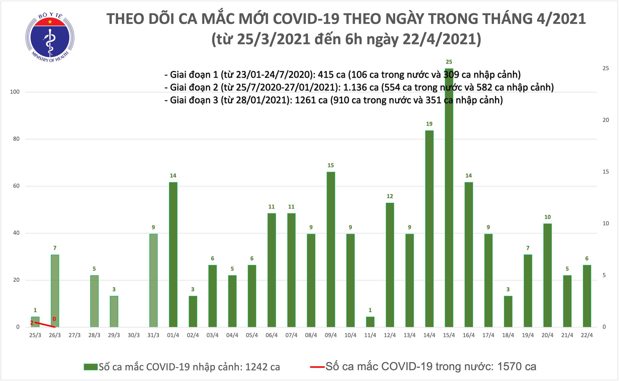 Số ca mắc ở Việt Nam:- Tính đến 6h ngày 22/4: Việt Nam có tổng cộng 1570 ca mắc COVID-19 do lây nhiễm trong nước, trong đó số lượng ca mắc mới tính từ ngày 27/1 đến
