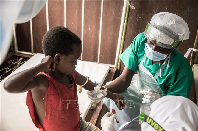 Nhân viên y tế lấy mẫu máu xét nghiệm cho em bé tiếp xúc với bệnh nhân mắc đậu mùa khỉ tại Zomea Kaka, CH Trung Phi. Ảnh tư liệu: AFP/TTXVN