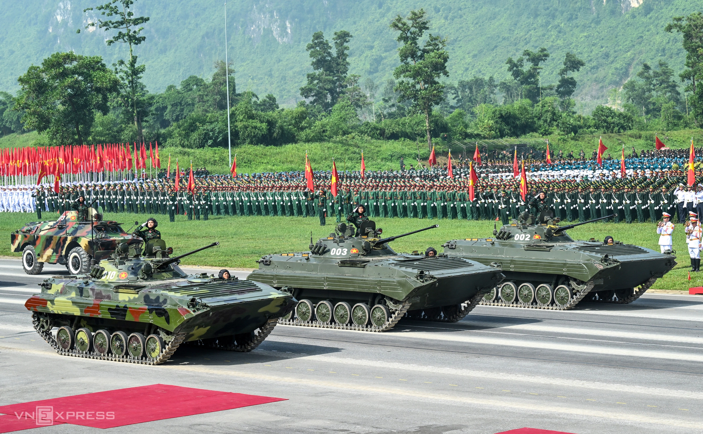 Sau màn diễu binh của các khối đi là khối xe pháo quân sự trên đường hành tiến. Dẫn đầu là lực lượng tăng thiết giáp với truyền thống trận đầu ra quân đánh thắng ở Tà May, Làng Vây đến các chiến dịch cánh đồng Chum, Đường 9 Nam Lào, Tây Nguyên…
