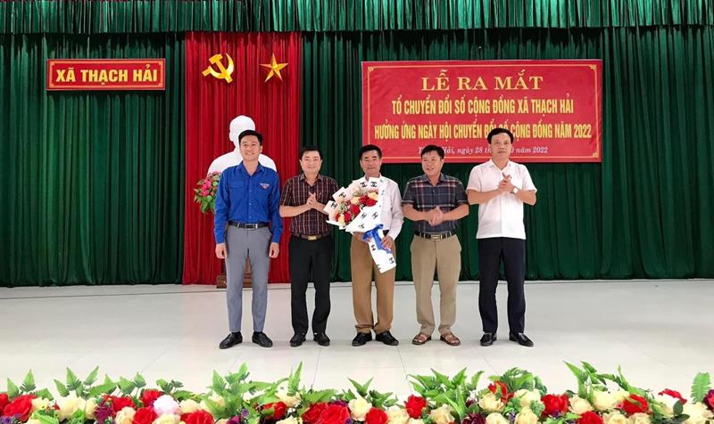 Lãnh đạo huyện tặng hoa chúc mừng Tổ chuyển đổi số cộng đồng xã Thạch Hải