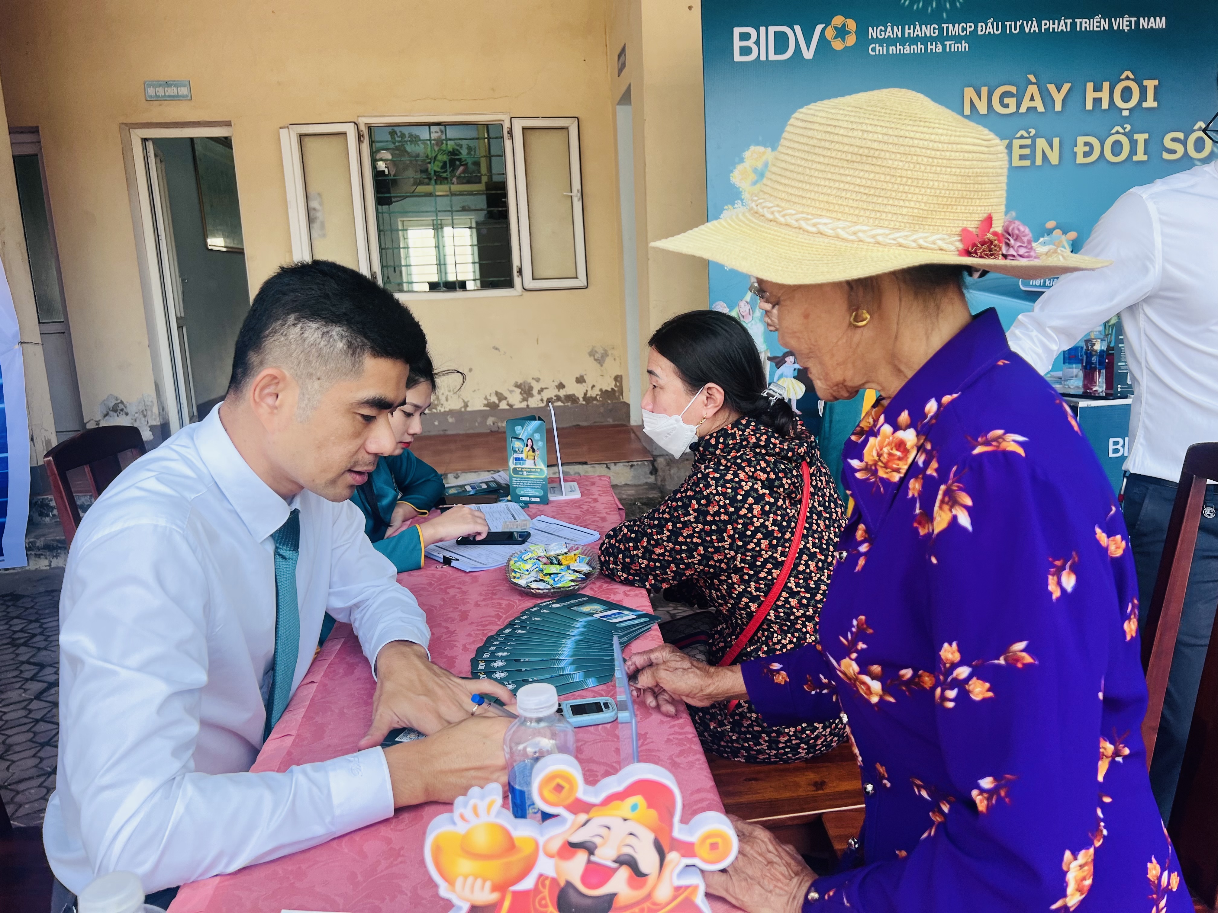Cán bộ ngân hàng BIDV hướng dẫn người dân làm thẻ ngân hàng, ví điện tử để trả lương cho đối tượng chính sách, đối tượng hưu trí, tiền điện qua thẻ ngân hàng