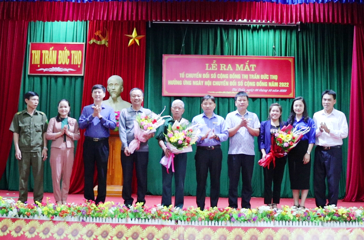Phó Chủ tịch UBND huyện Hoàng Xuân Hùng, Trưởng phòng Văn hóa Thông tin Nguyễn Văn Đức và Lãnh đạo Thị trấn Đức Thọ tặng hoa cho các Tổ chuyển đổi số cộng đồng.