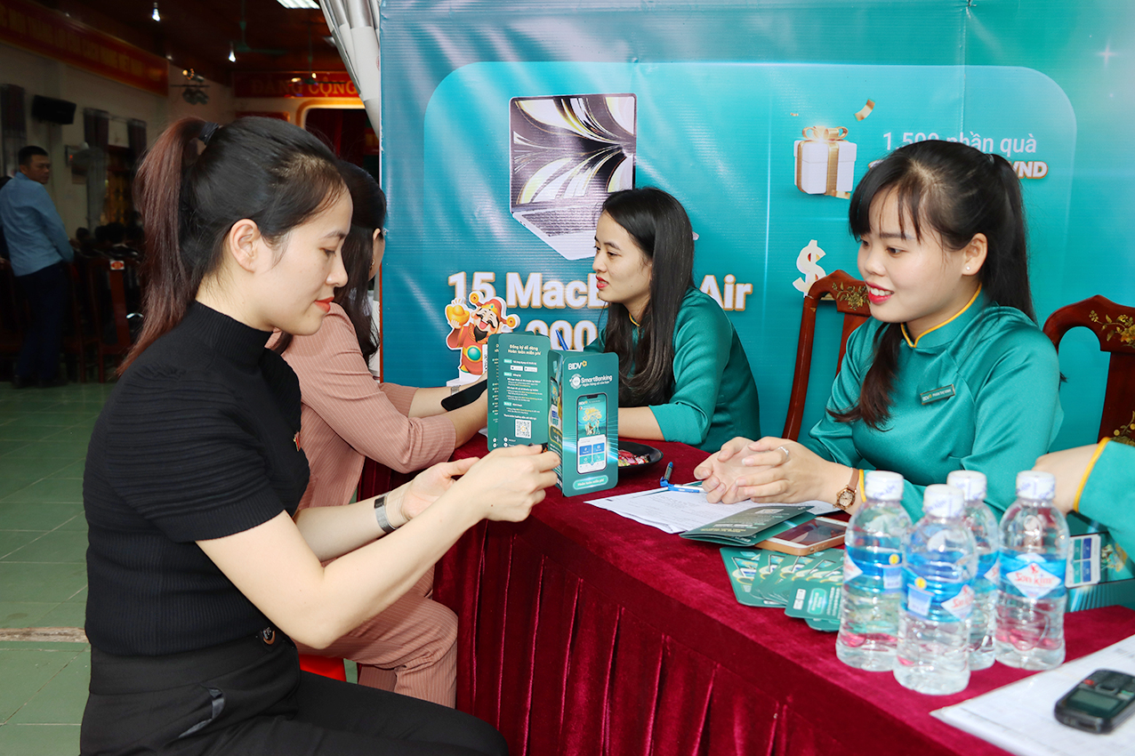 Phó Chủ tịch UBND huyện Hoàng Xuân Hùng, Trưởng phòng Văn hóa Thông tin Nguyễn Văn Đức và Lãnh đạo thị trấn Đức Thọ trải nghiệm gian hàng chuyển đổi số của Ngân hàng BIDV ...