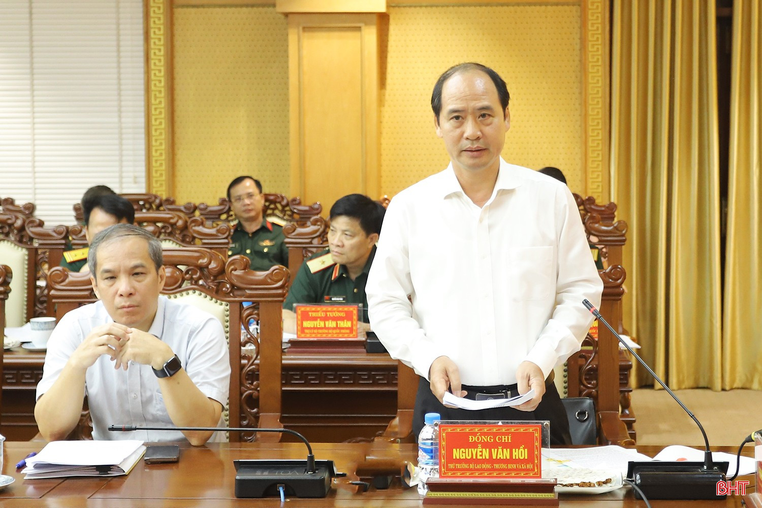 Thứ trưởng Bộ LĐ-TB&XH Nguyễn Văn Hồi trao đổi về các kiến nghị, đề xuất của Hà Tĩnh liên quan tới lĩnh vực phụ trách.