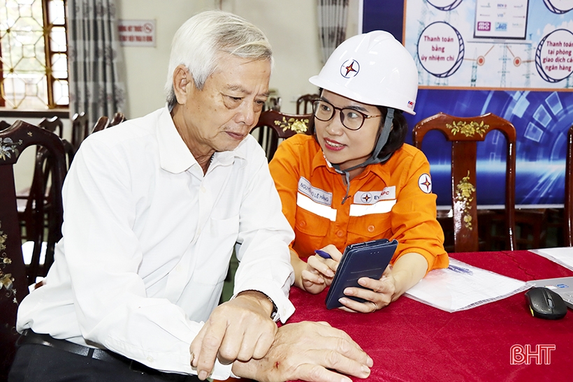 Cán bộ Chi nhánh Điện lực Đức Thọ hướng dẫn người dân cái đặt phần mềm nộp tiền điện qua tài khoản ngân hàng