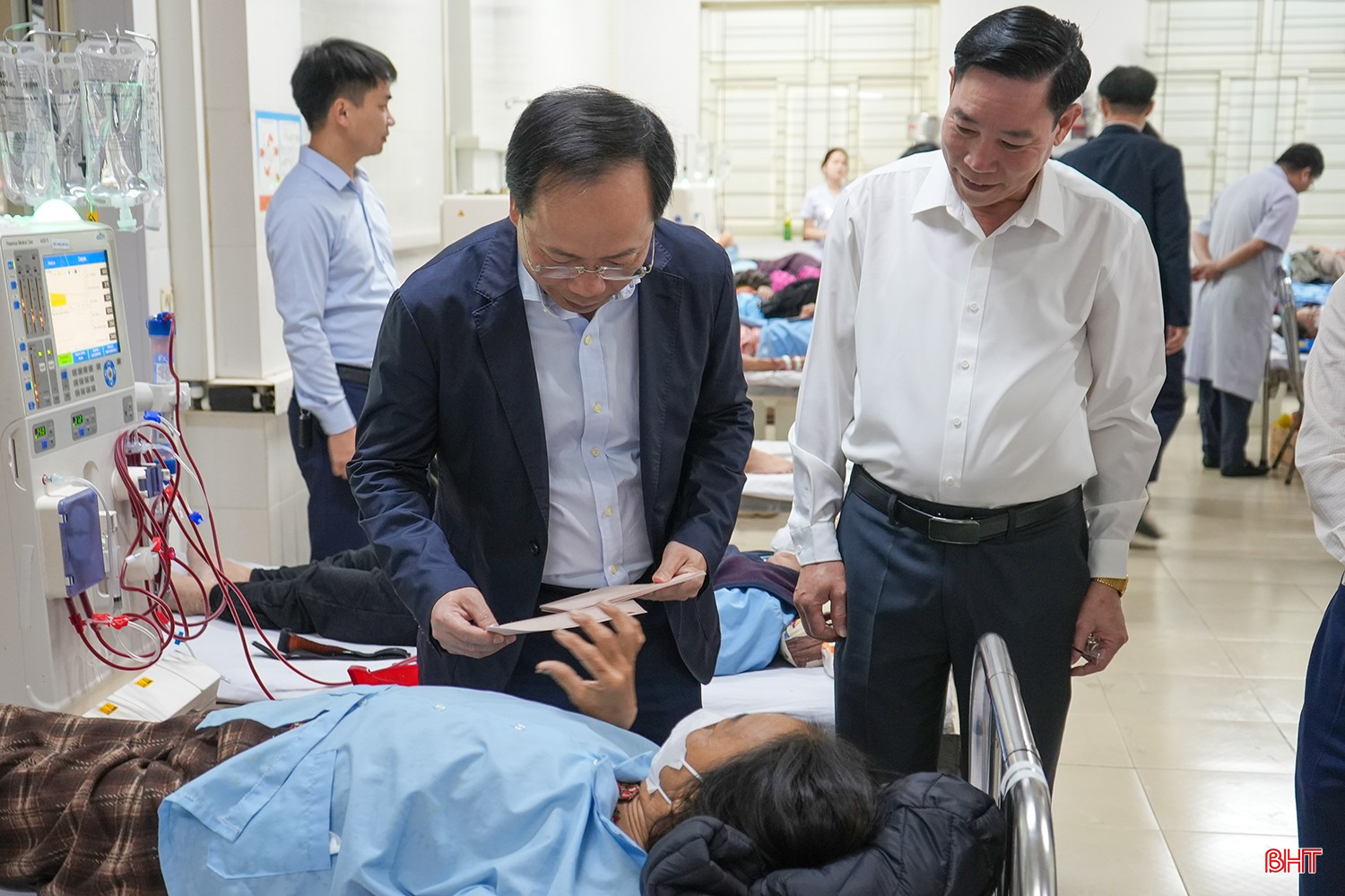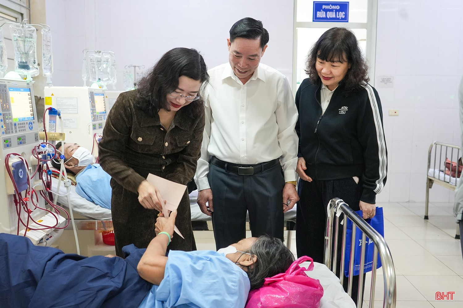 Tại Bệnh viện Đa khoa tỉnh Hà Tĩnh, đoàn đã ân cần thăm hỏi sức khỏe, chia sẻ, động viên tinh thần các bệnh nhân đang điều trị, đặc biệt là những bệnh nhân chạy thận định kỳ. Những lời chúc Tết chân tình, những cái bắt tay ấm áp đã tiếp thêm động lực để người bệnh vững tin hơn trong hành trình điều trị.