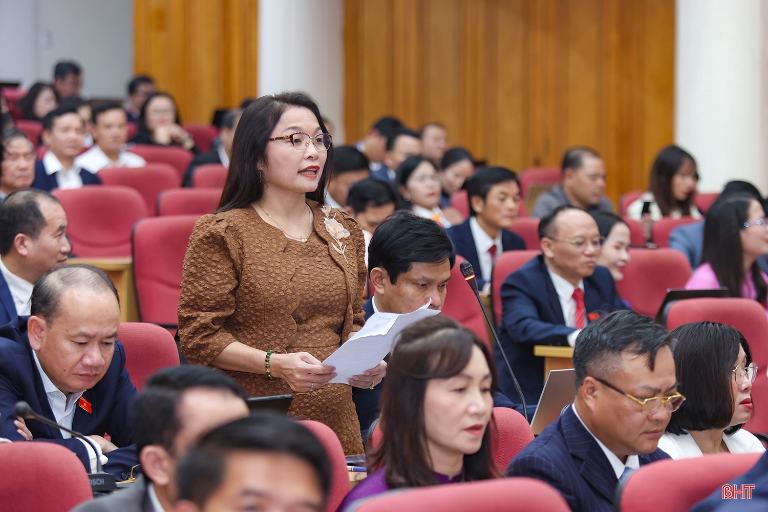 Phó Bí thư chuyên trách Đảng ủy UBND tỉnh Nguyễn Thị Hà Tân chất vấn đại biểu HĐND tỉnh tại Kỳ họp 34, HĐND tỉnh Hà Tĩnh khóa XVIII diễn ra vào tháng 12/2025.