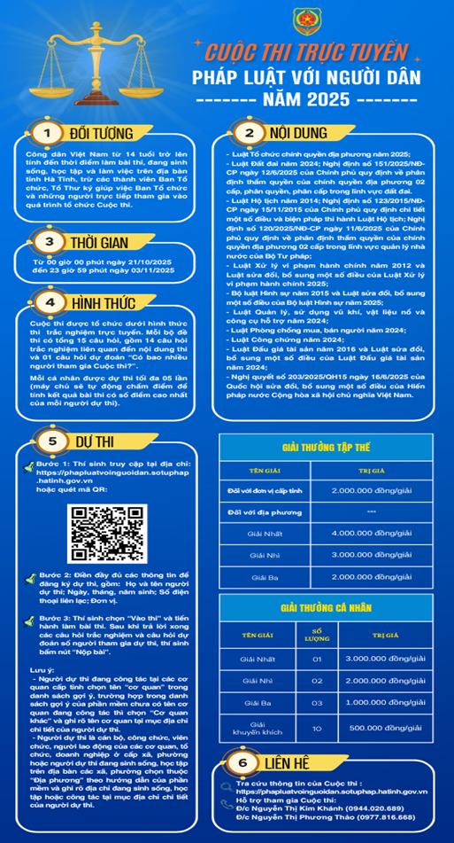 Tra cứu, tìm hiểu thông tin, thể lệ, hướng dẫn, giải đáp, cập nhật hoạt động của Cuộc thi: Địa chỉ: https://phapluatvoinguoidan.sotuphap.hatinh.gov.vn hoặc qua mã QR:
