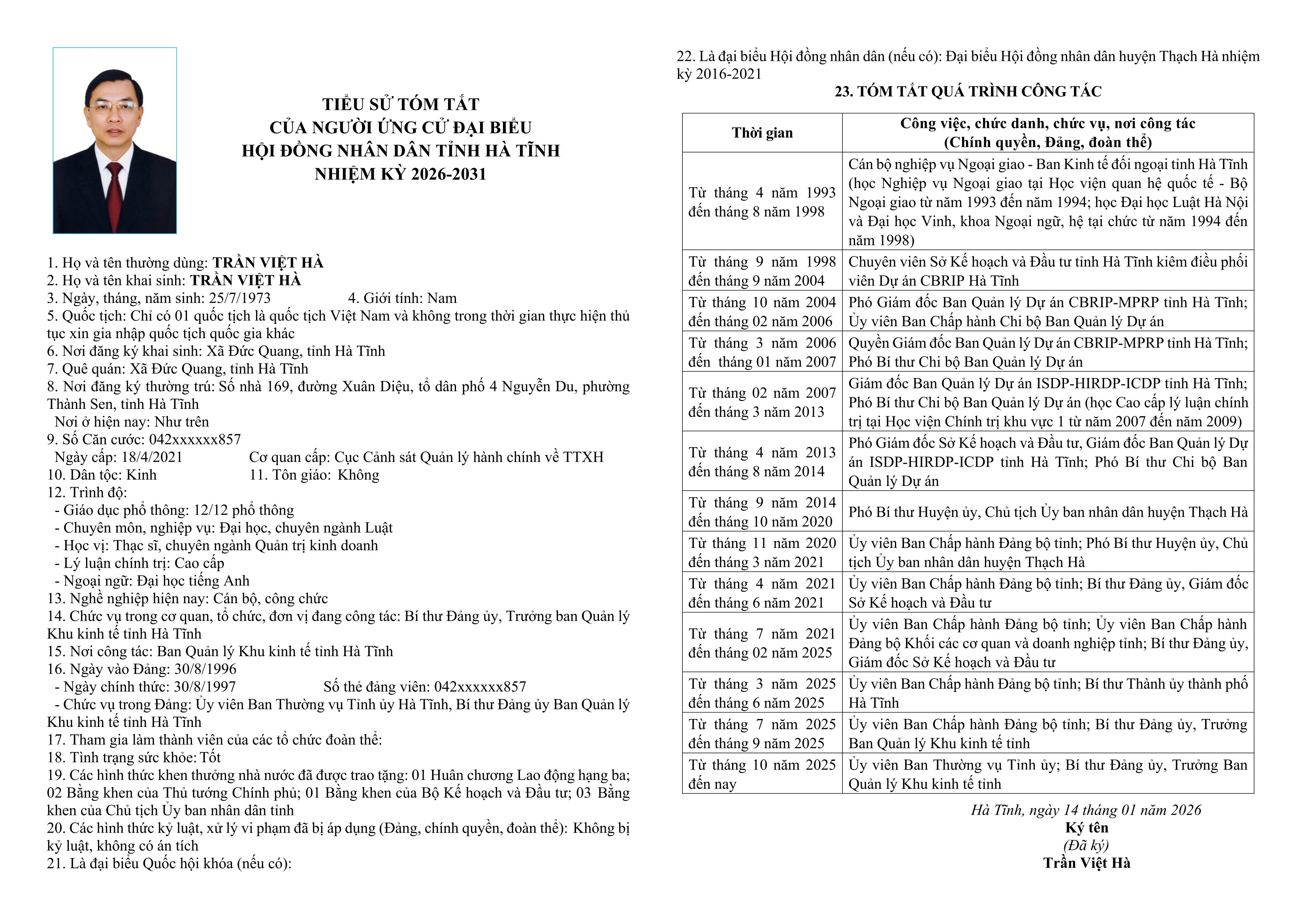 1. Ông Trần Việt Hà - Ủy viên Ban Thường vụ Tỉnh ủy; Bí thư Đảng ủy, Trưởng Ban Quản lý Khu kinh tế tỉnh Hà Tĩnh.