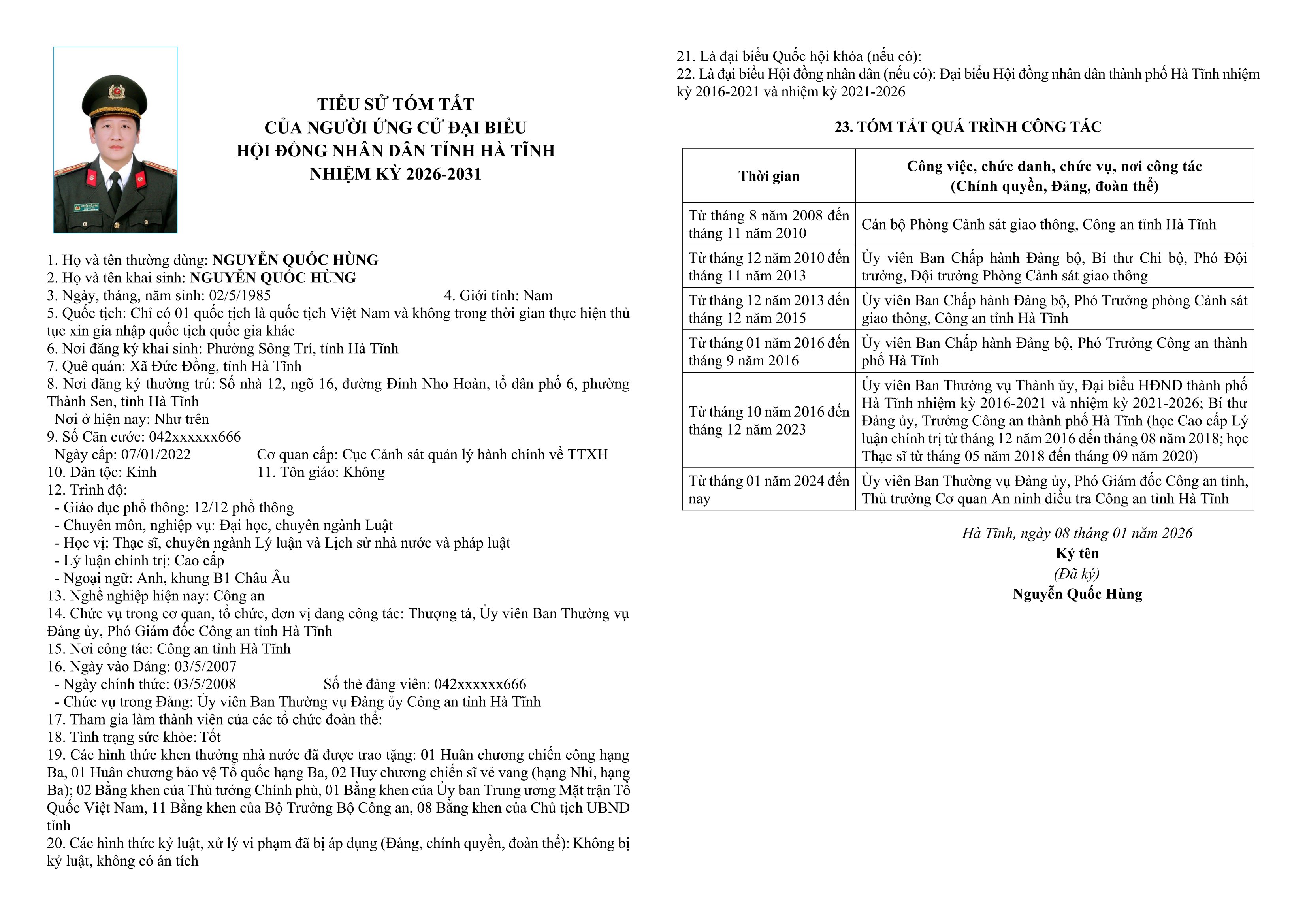 5. Ông Nguyễn Quốc Hùng - Thượng tá; Ủy viên Ban Thường vụ Đảng ủy, Phó Giám đốc Công an tỉnh Hà Tĩnh.
