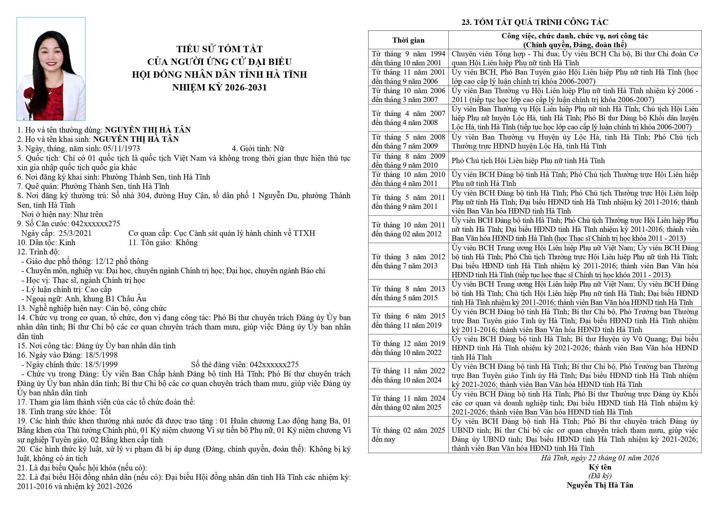 6. Nguyễn Thị Hà Tân - Ủy viên BCH Đảng bộ tỉnh Hà Tĩnh; Phó Bí thư chuyên trách Đảng ủy UBND tỉnh; Bí thư Chi bộ các cơ quan chuyên trách tham mưu, giúp việc Đảng ủy UBND tỉnh; Đại biểu HĐND tỉnh Hà Tĩnh nhiệm kỳ 2021-2026; thành viên Ban Văn hóa HĐND tỉnh Hà Tĩnh