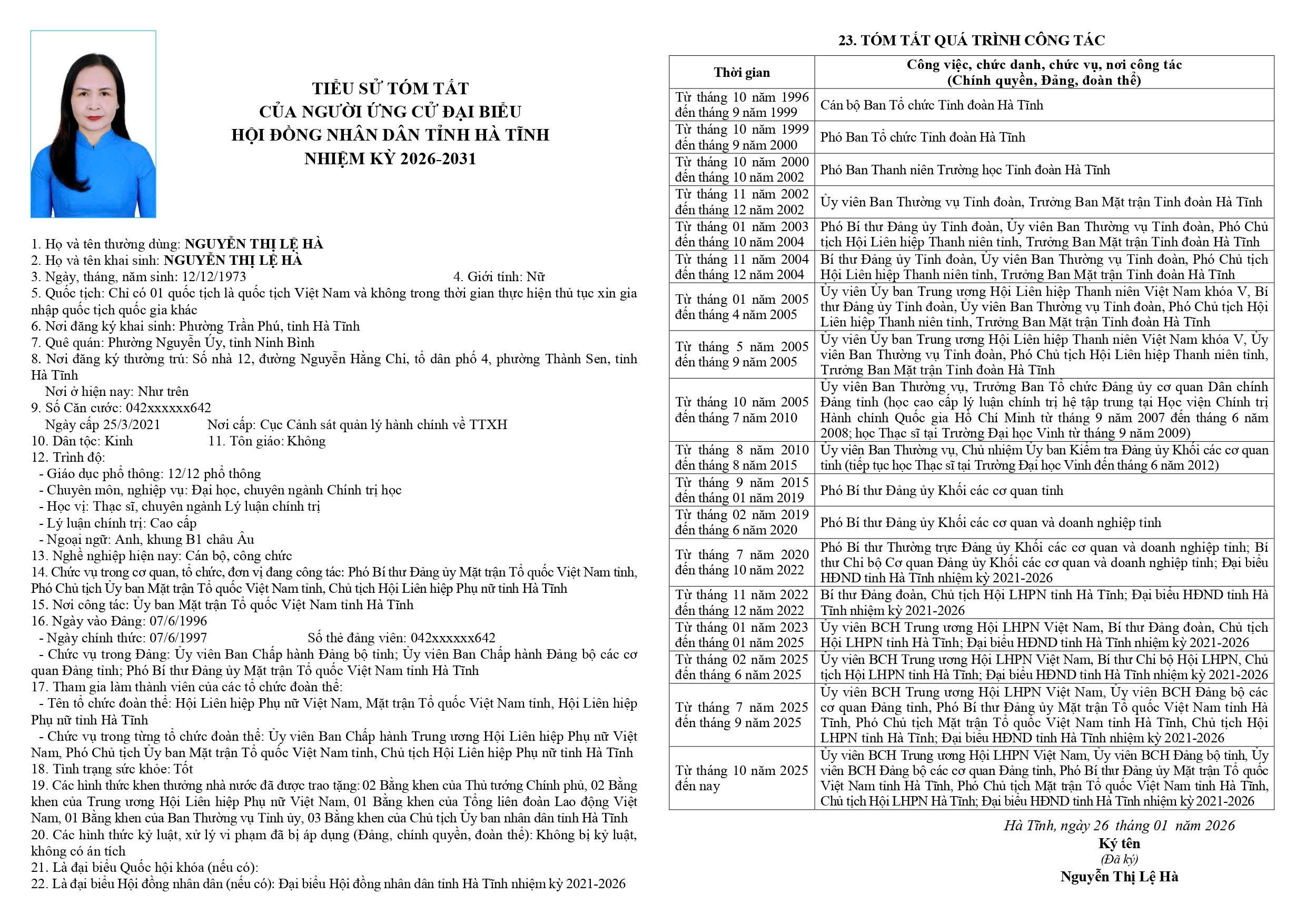 3. Nguyễn Thị Lệ Hà - Ủy viên BCH Trung ương Hội LHPN Việt Nam, Ủy viên BCH Đảng bộ tỉnh, Ủy viên BCH Đảng bộ các cơ quan Đảng tỉnh, Phó Bí thư Đảng ủy Mặt trận Tổ quốc Việt Nam tỉnh Hà Tĩnh, Phó Chủ tịch Mặt trận Tổ quốc Việt Nam tỉnh Hà Tĩnh, Chủ tịch Hội LHPN Hà Tĩnh; Đại biểu HĐND tỉnh Hà Tĩnh nhiệm kỳ 2021-2026