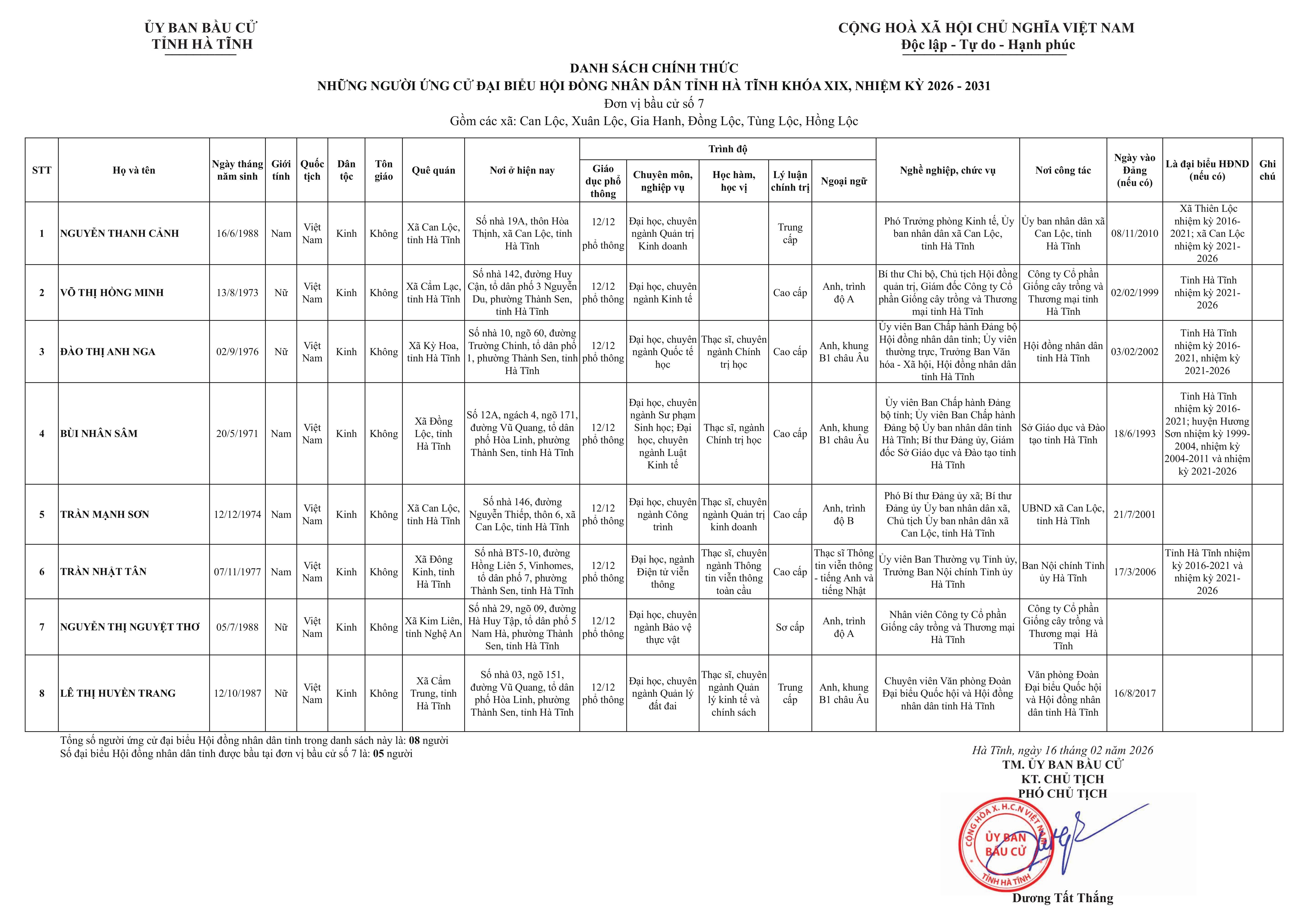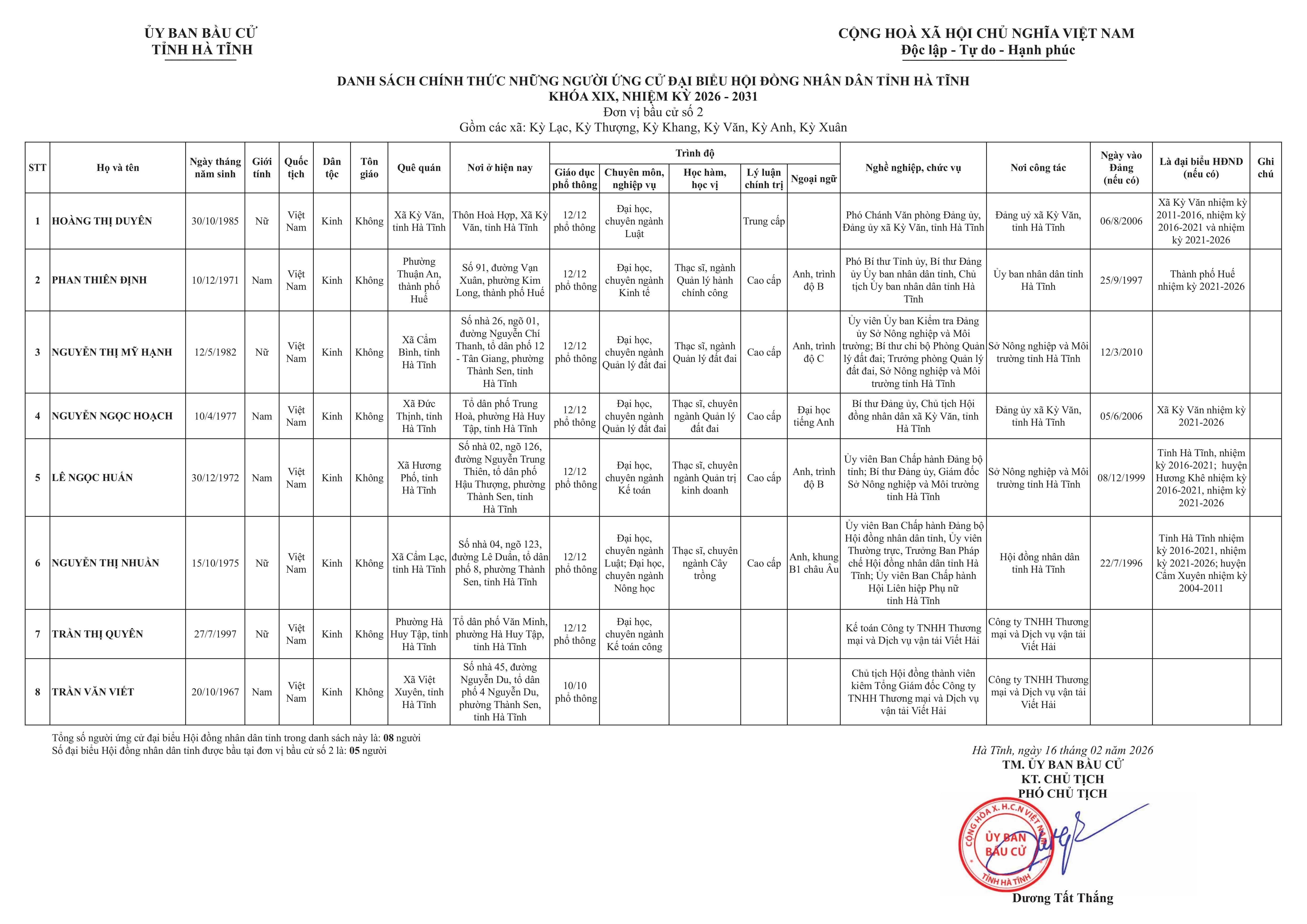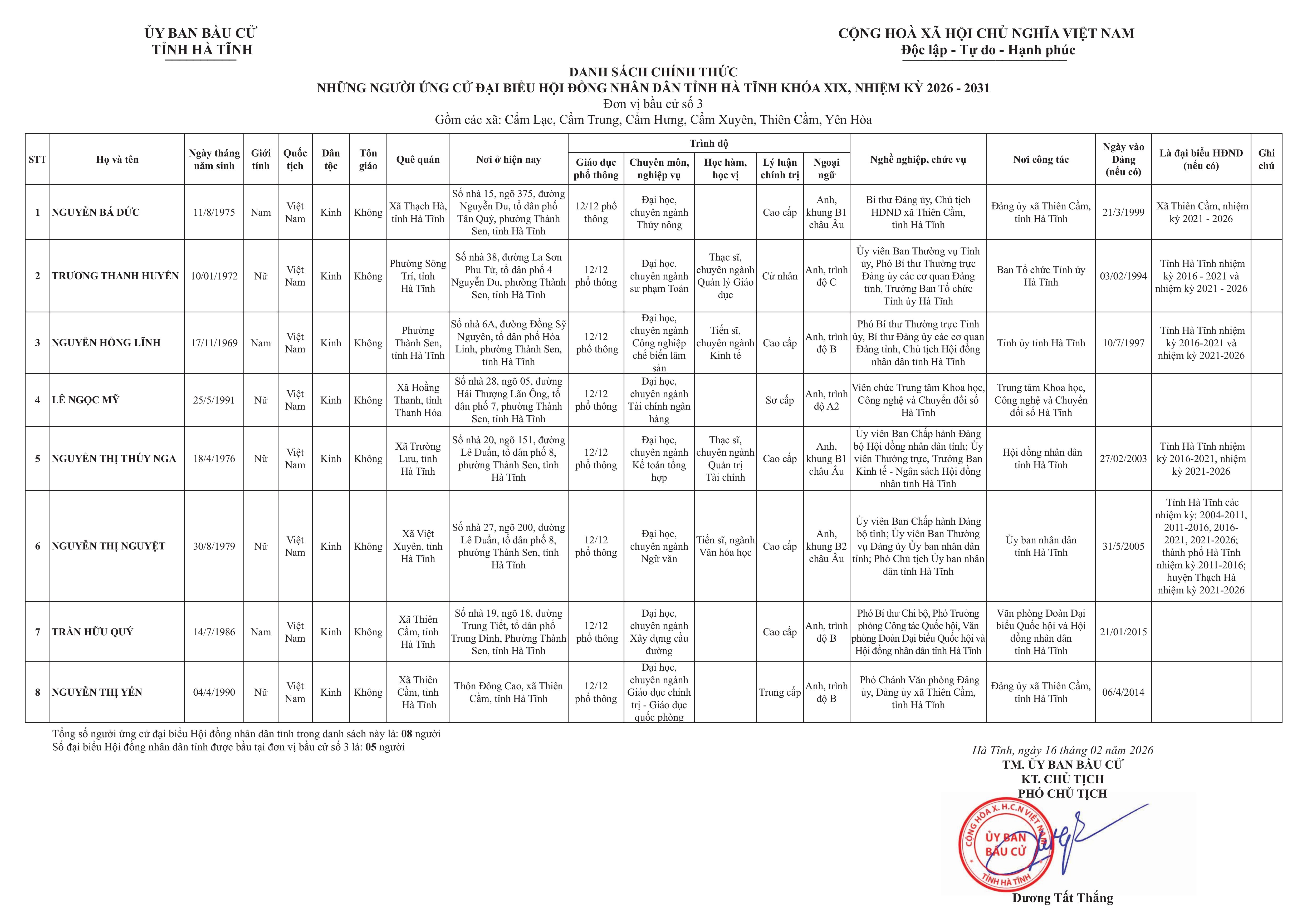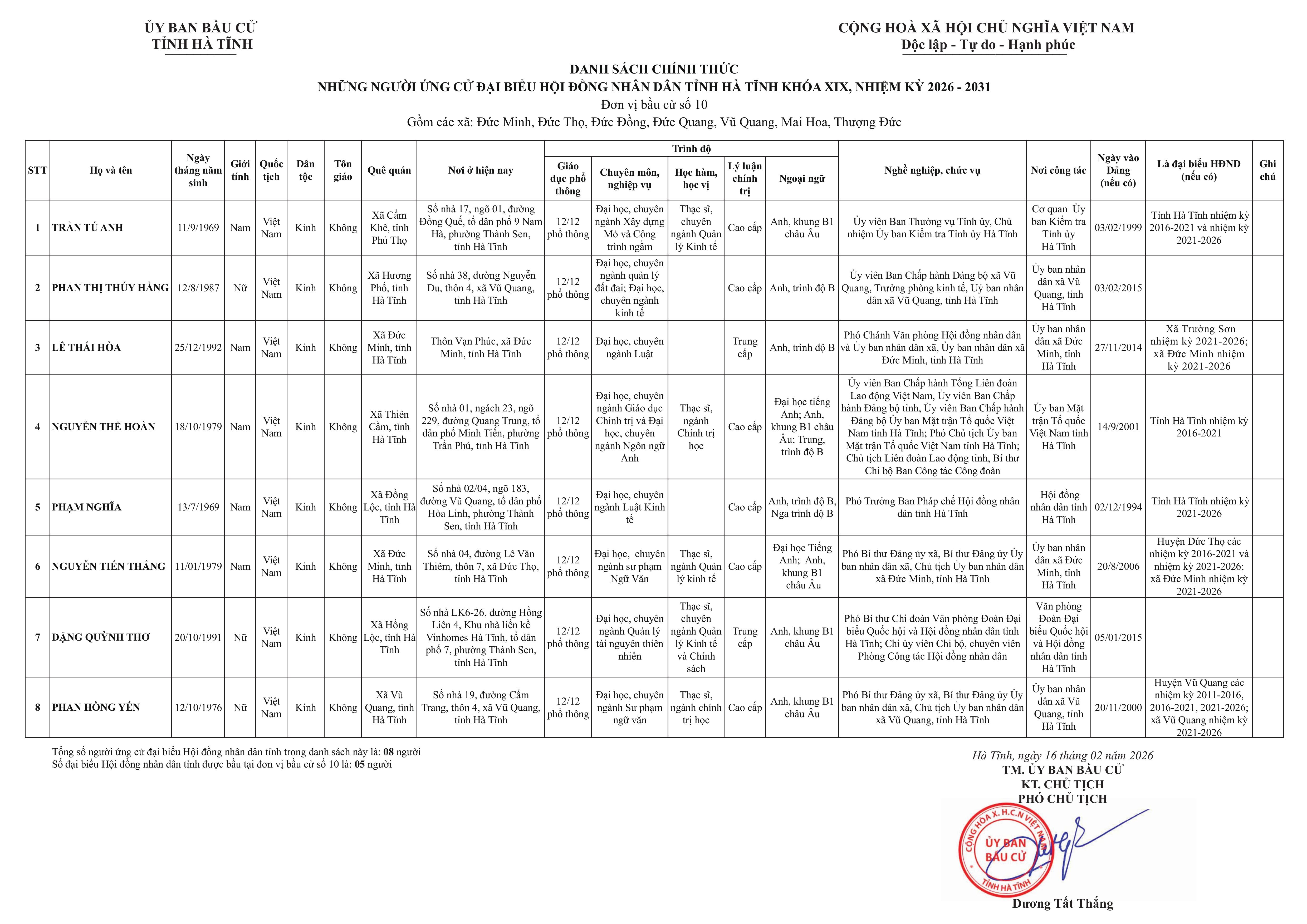 Danh sách chính thức những người ứng cử đại biểu HĐND tỉnh Hà Tĩnh khóa XIX, nhiệm kỳ 2026-2030