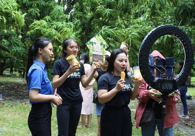 Người trẻ tham gia hỗ trợ nông dân livestream bán nông sản, một mô hình giúp người dân tiếp cận với chuyển đổi số