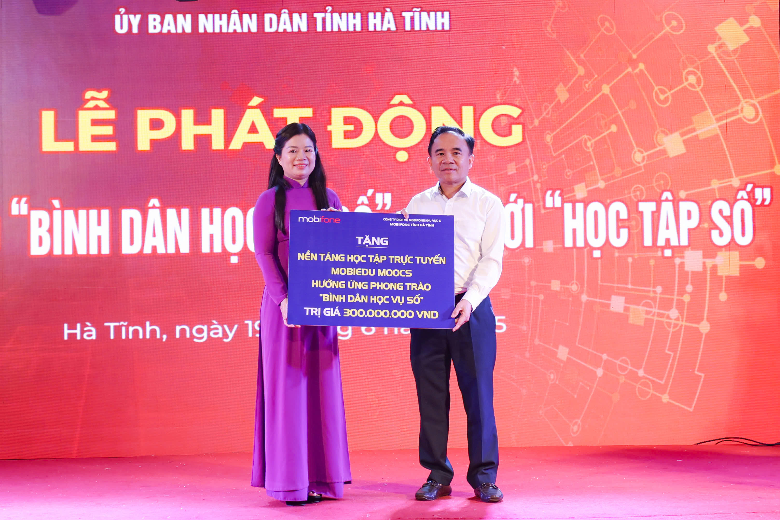 Dịp này, Mobifone Hà Tĩnh trao tặng Nền tảng học tập trực tuyến Mobiedu Moocs hưởng ứng phong trào "Bình dân học vụ số" trị giá 300 triệu đồng.