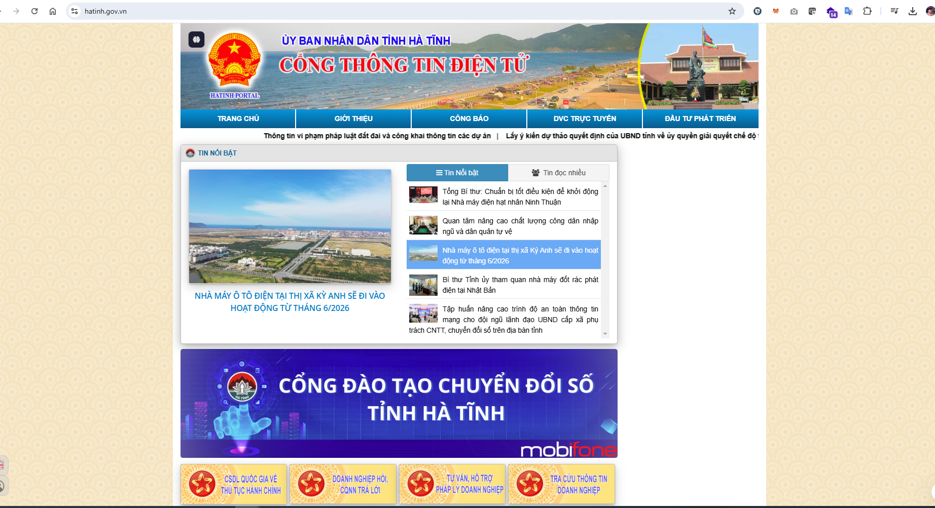 Để tham gia đào tạo chuyển đổi số trên tất cả các lĩnh vực, mỗi người dân, cán bộ, công chức, viên chức có thể truy cập Cổng thông tin điện tử của tỉnh Hà Tĩnh (https://hatinh.gov.vn), chọn mục “Cổng đào tạo chuyển đổi số tỉnh Hà Tĩnh”.