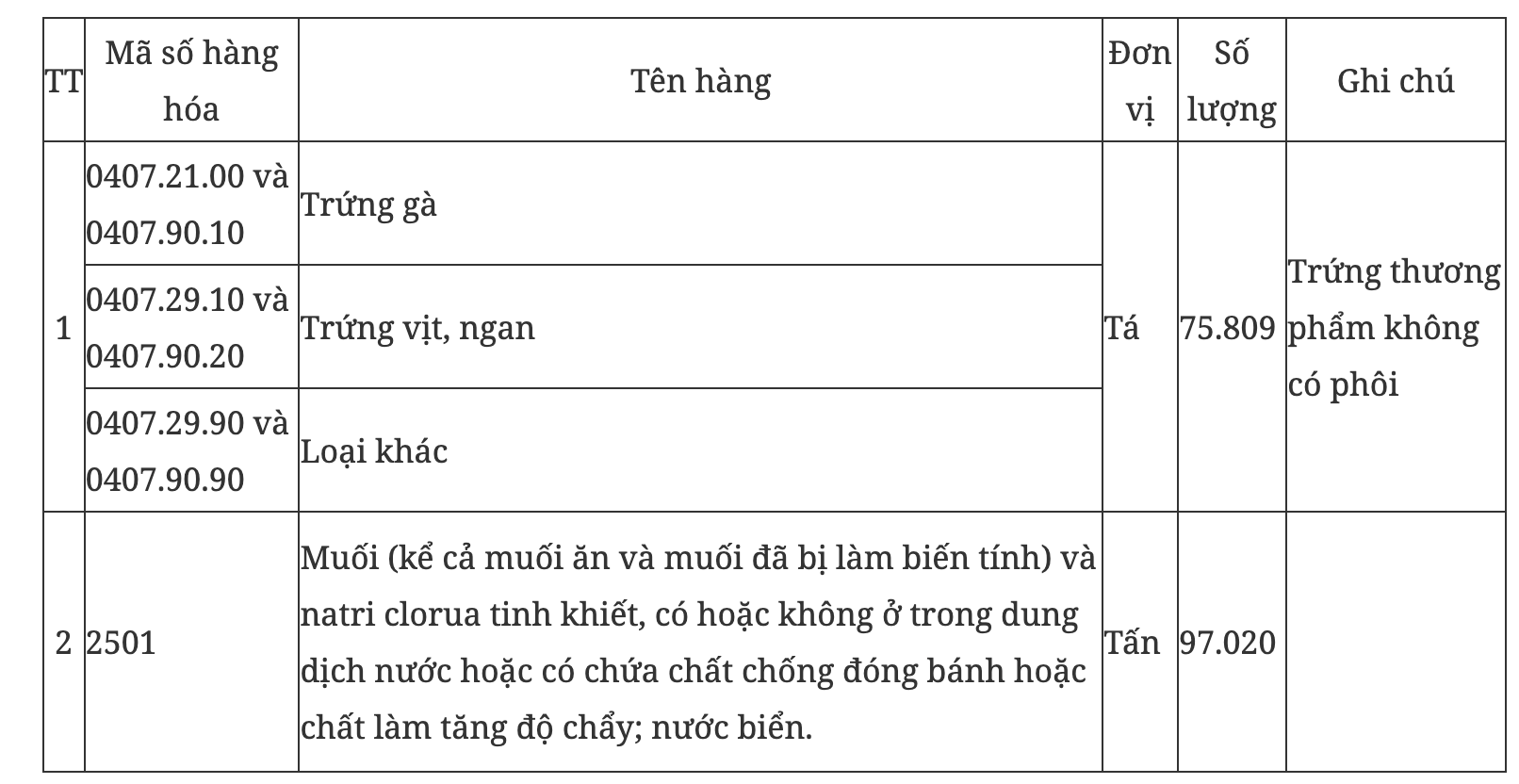 Theo Thông tư, lượng hạn ngạch thuế quan nhập khẩu mặt hàng muối, trứng gia cầm năm 2026 được quy định như sau: