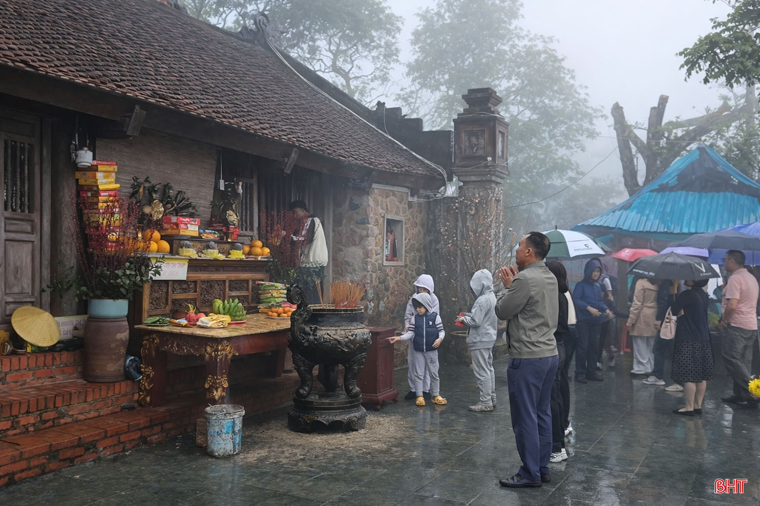Với độ cao gần 600m so với mực nước biển, thời tiết ở chùa Hương Tích sáng mồng 2 Tết mưa nặng hạt hơn dưới chân núi...