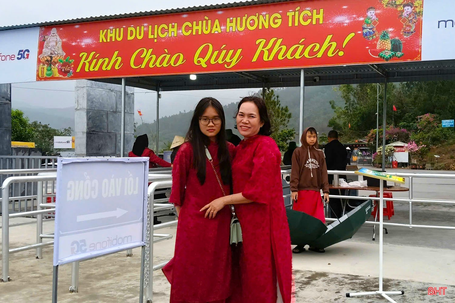 Chị Nguyễn Thị Kim Dung (bên phải, trú ở tỉnh Đồng Nai) cho biết: "Quê chồng tôi ở xã Tùng Lộc. Tôi từng lên chùa một vài lần nhưng đây là lần đầu tiên có cơ hội đi vào dịp Tết. Ngoài những thay đổi tích cực về cơ sở hạ tầng, tôi cảm thấy dịch vụ tại KDL chùa Hương Tích ngày càng thuận tiện. Đặc biệt, tôi cảm thấy du xuân, vãn cảnh chùa trong thời tiết mây mù như sáng nay có những điều thú vị riêng. Các thành viên gia đình tôi đã có một chuyến du xuân đầu năm ý nghĩa".