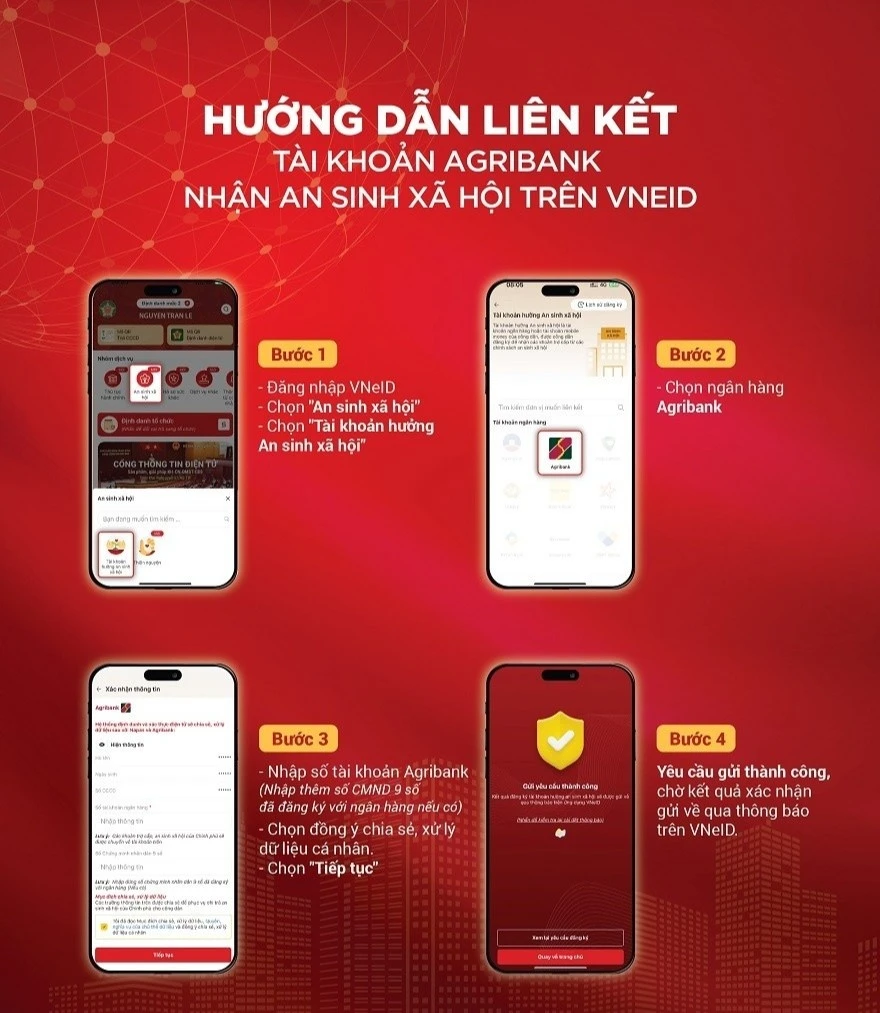 Các bước liên kết tài khoản an sinh xã hội trên VNeID với tài khoản ngân hàng. Ảnh: Agribank.